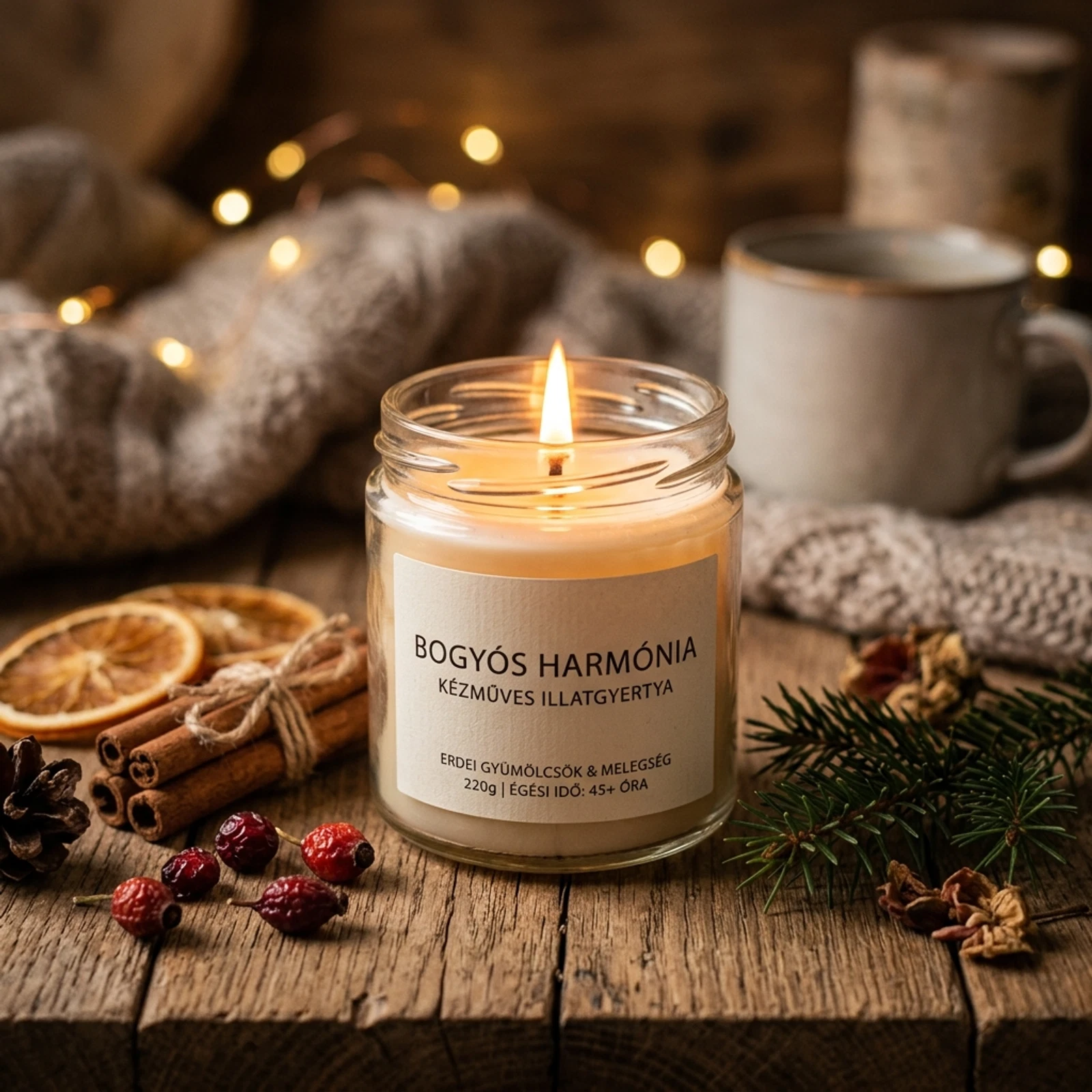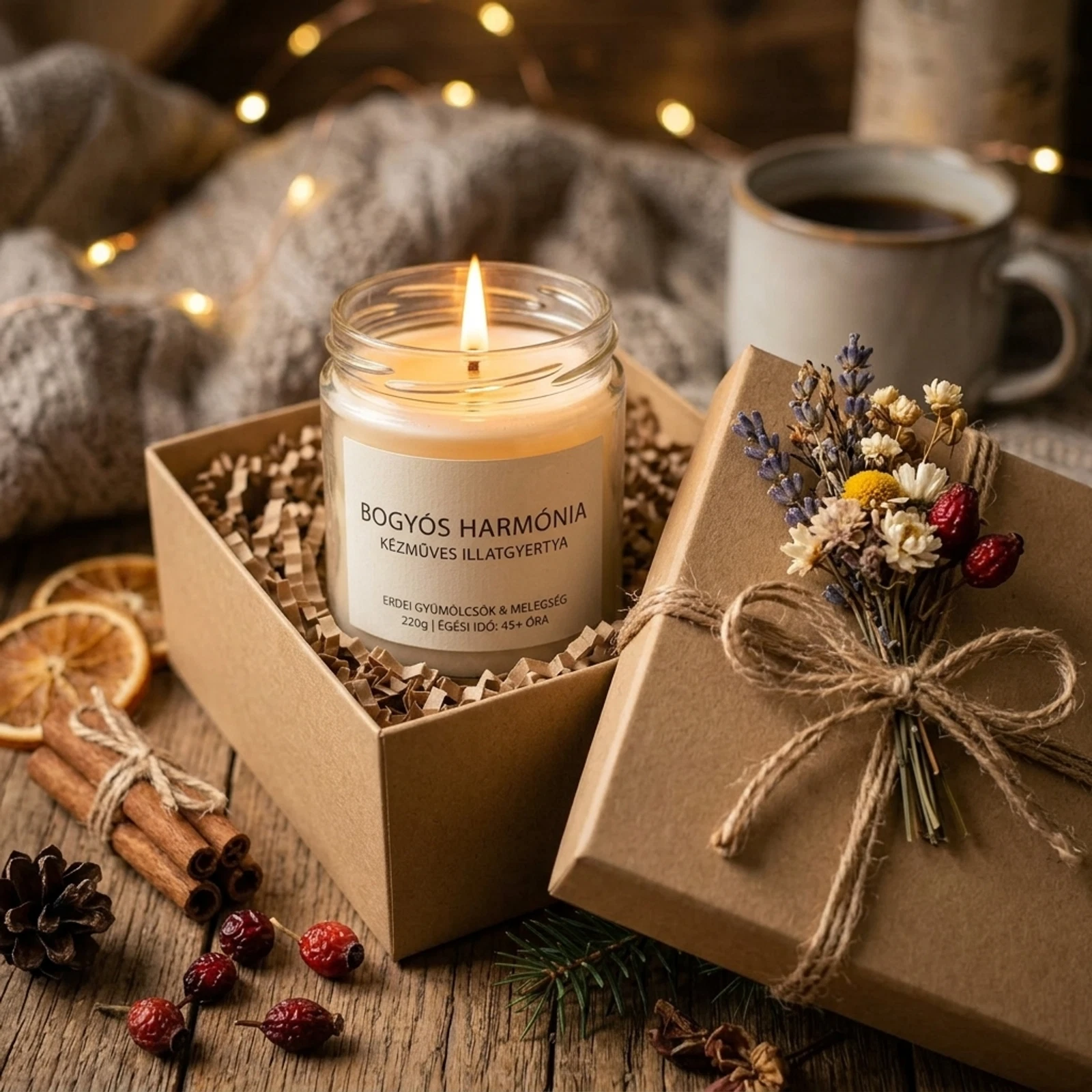 Varázsold otthonod igazi menedékké a Bogyós Harmónia illatgyertyával! Ez a kézzel készült különlegesség az érett, lédús erdei gyümölcsök édeskés és frissítő aromáját ötvözi, hogy meghitt hangulatot teremtsen bármelyik helyiségben. Legyen szó egy hosszú munkanap utáni relaxációról vagy egy baráti összejövetelről, a gyertya lágy fénye és természetes illata azonnal levesz a lábadról. Prémium minőségű viaszból készült, így hosszan tartó és egyenletes égést biztosít, miközben nemcsak a szemedet, de az érzékeidet is kényezteti. Ideális ajándék szeretteidnek vagy egy kis jutalom saját magadnak. Élvezd a természet bogyós kincseinek varázsát minden egyes meggyújtással, és engedd, hogy a nyugalom átjárja az otthonodat.